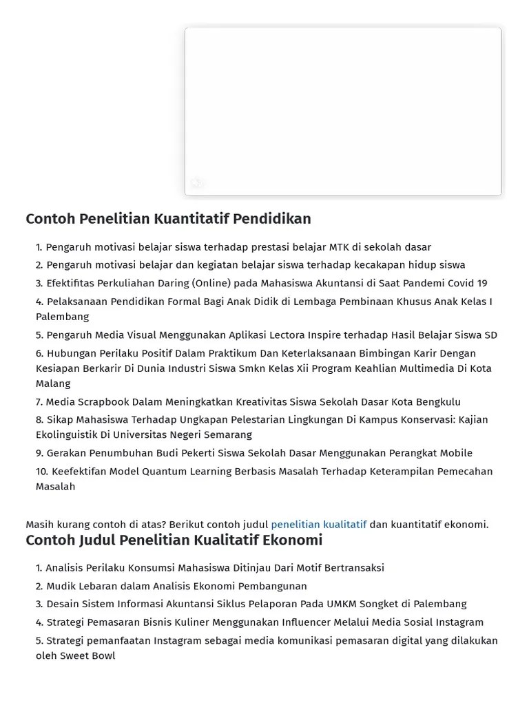 Ketiga, penelitian kuantitatif ini dilakukan untuk mengukur satu atau lebih variabel pada penelitian yang sedang dilakukan. Variabel bisa dikatakan sebagai segala sesuatu yang kita ukur dalam arti penelitian. Secara praktis dapat berupa apa saja, seperti objek, jumlah waktu, perasaan, peristiwa, atau bahkan ide. Sebagai contoh, jika kita mempelajari perasaan orang tentang berbagai acara televisi, variabel dalam. Nah, untuk mempermudah sobat mengerti, yuk simak contohnya: 10+ judul skripsi sosial ini lengkap dengan metode yang digunakannya. Sebagaimana yang kita tahu, dalam dunia perkuliahan hal ini boleh dibilang adalah sesuatu yang sangat penting. Hanya sebagai contoh bagi para mahasiswa yang ingin melakukakan penelitian. 143 contoh judul skripsi beserta penjelasan lengkapnya. Pendidikan merupakan ”proses budaya untuk meningkatkan harkat dan martabat manusia, melalui proses yang panjang dan berlangsung sepanjang hayat. Sebelum memulai menulis skripsi pastinya referensi untuk judul skripsi apa yang mau Contoh judul penelitian satu variabel. 15/11/2021 · 20 contoh variabel terikat dan bebas dalam penelitian.