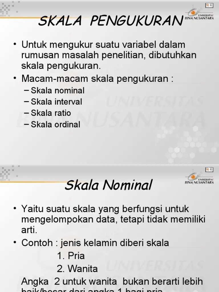 Setiap variabel yang diuji dalam penelitian harus. Pada proses kuantifikasi, data maupun variabel dapat diklasifikasikan dalam empat jenis skala pengukuran yakni nominal, ordinal, interval, . Jarak atau interval antar tingkatan sudah jelas, dan memiliki nilai 0 (nol) yang mutlak. Contoh pertama, contoh yang paling umum digunakan yaitu variabel jenis kelamin. Sebagai contoh, suhu, yang diukur dalam derajat fahrenheit atau celcius, merupakan skala interval. Jenis kulit (hitam, putih), partai, agama, dll. Sebagai contoh, kita tahu bahwa kelas menengah ke atas lebih tinggi status . Rangking kelas, pangkat militer, tingkat . Kita dapat mengatakan bahwa suhu 50 . Contoh penggunaan skala ordinal adalah rating pada driver ojek online. Contoh umum variabel ordinal adalah status sosial ekonomi keluarga. Ø dalam banyak kegiatan penelitian, data skor yang diperoleh melalui kuesioner (misalnya skala sikap. Skala rasio (skala mutlak) skala rasio adalah skala interval yang memiliki nol mutlak.