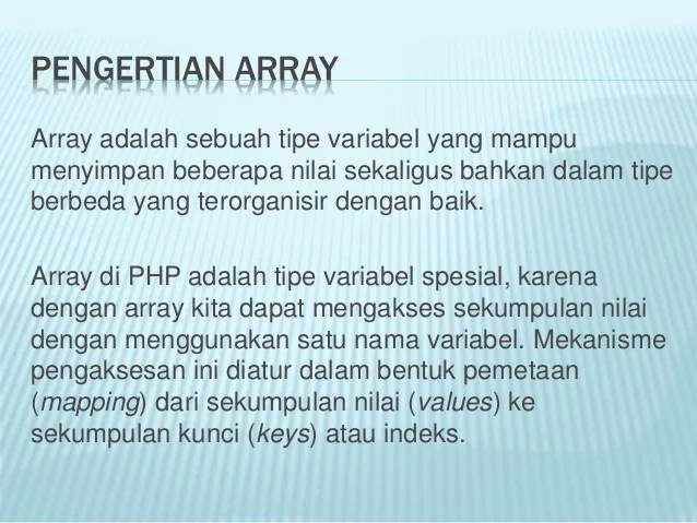 Kita bisa saja mendeklarasikan tiap datanya dalam 1 . Array merupakan konsep yang penting . Pengertian variabel array variabel array adalah sebuah struktur data yang terdiri atas satu atau lebih elemen variabel dengan tipe data yang sama, . Array, adalah satu variabel yang dapat berisi banyak data yang independent. Data yang disimpan diberikan indeks tertentu atau menggunakan nomer .