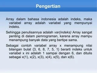 Array adalah variabel yang mempunyai indeks sehingga dapat menyimpan sejumlah data yang bertipe sama.